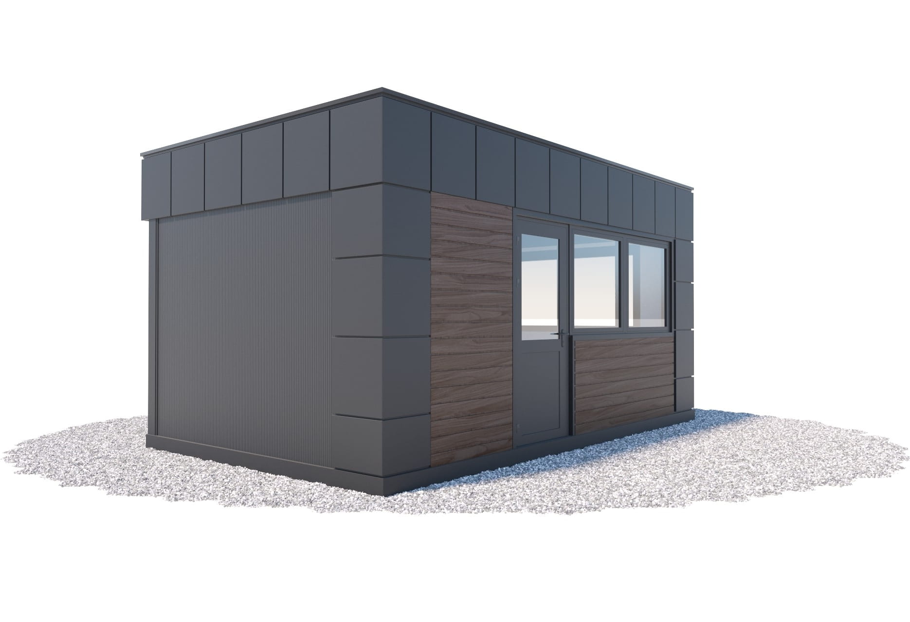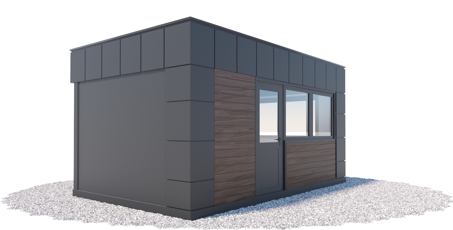 - kolor: grafit RAL 7016 (okna, drzwi, pas dolny, attyka, narożniki) - opcjonalnie dowolny kolor z palety RAL dla blach.