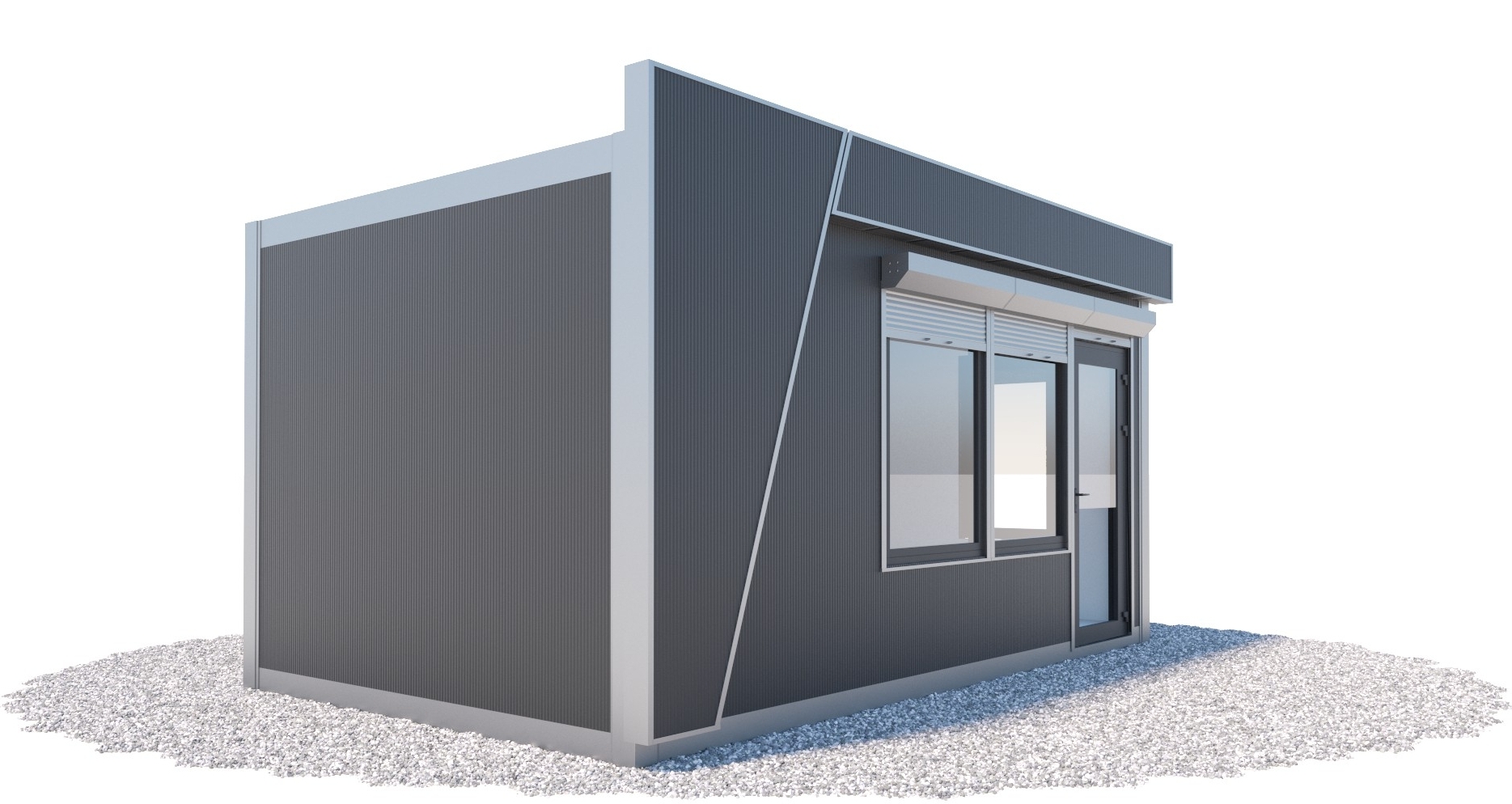 - kolor: srebrny RAL 9006 (narożniki, pas dolny i górny, attyka), grafit RAL 7016 (okna, drzwi) - opcjonalnie dowolny kolor z palety RAL dla blach.