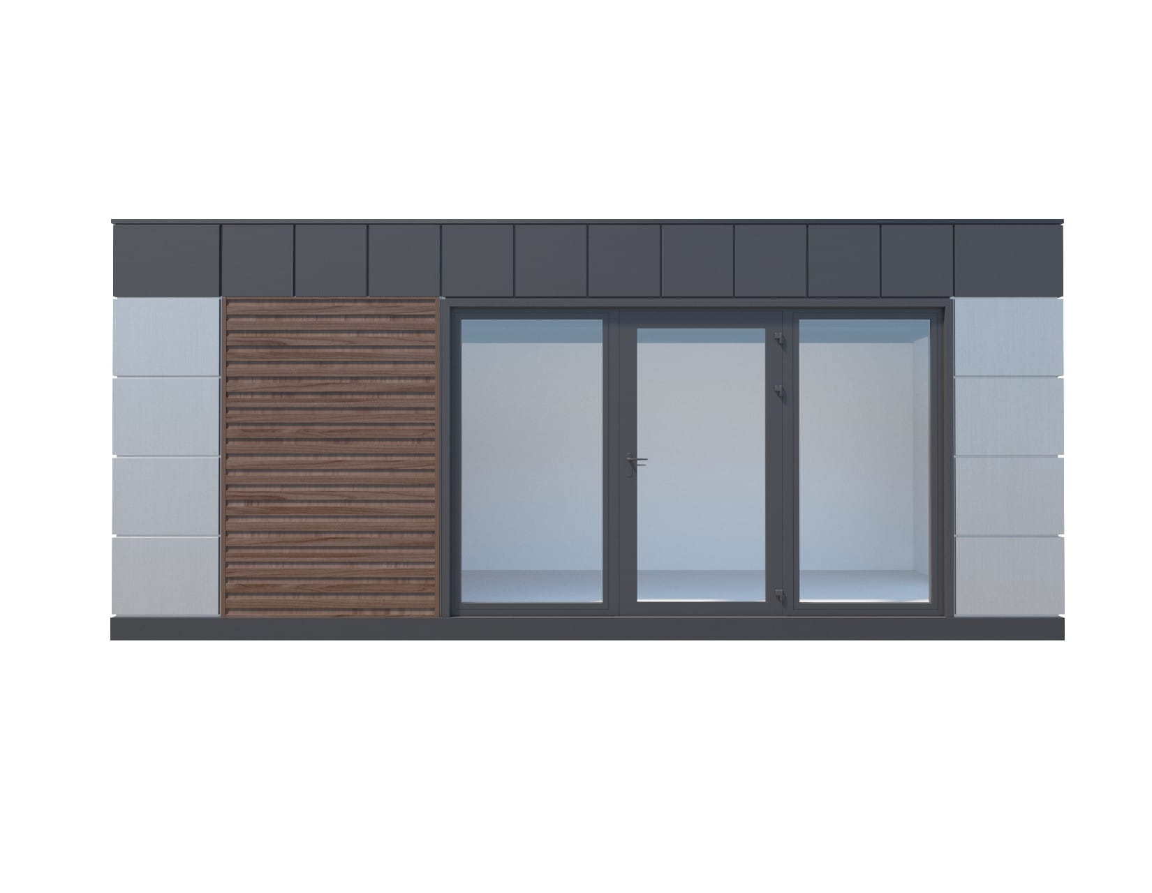 - standard: wykończenie systemowe - płyta warstwowa z profilem typu mikrofala + wykończenie przednich narożników w postaci kasetonów stalowych (kolor: RAL 7016; inne kolory z palety RAL dla blach - do ustalenia) + ozdobne panele blaszane (kolor: drewnopodobny orzech; inne kolory - do ustalenia),