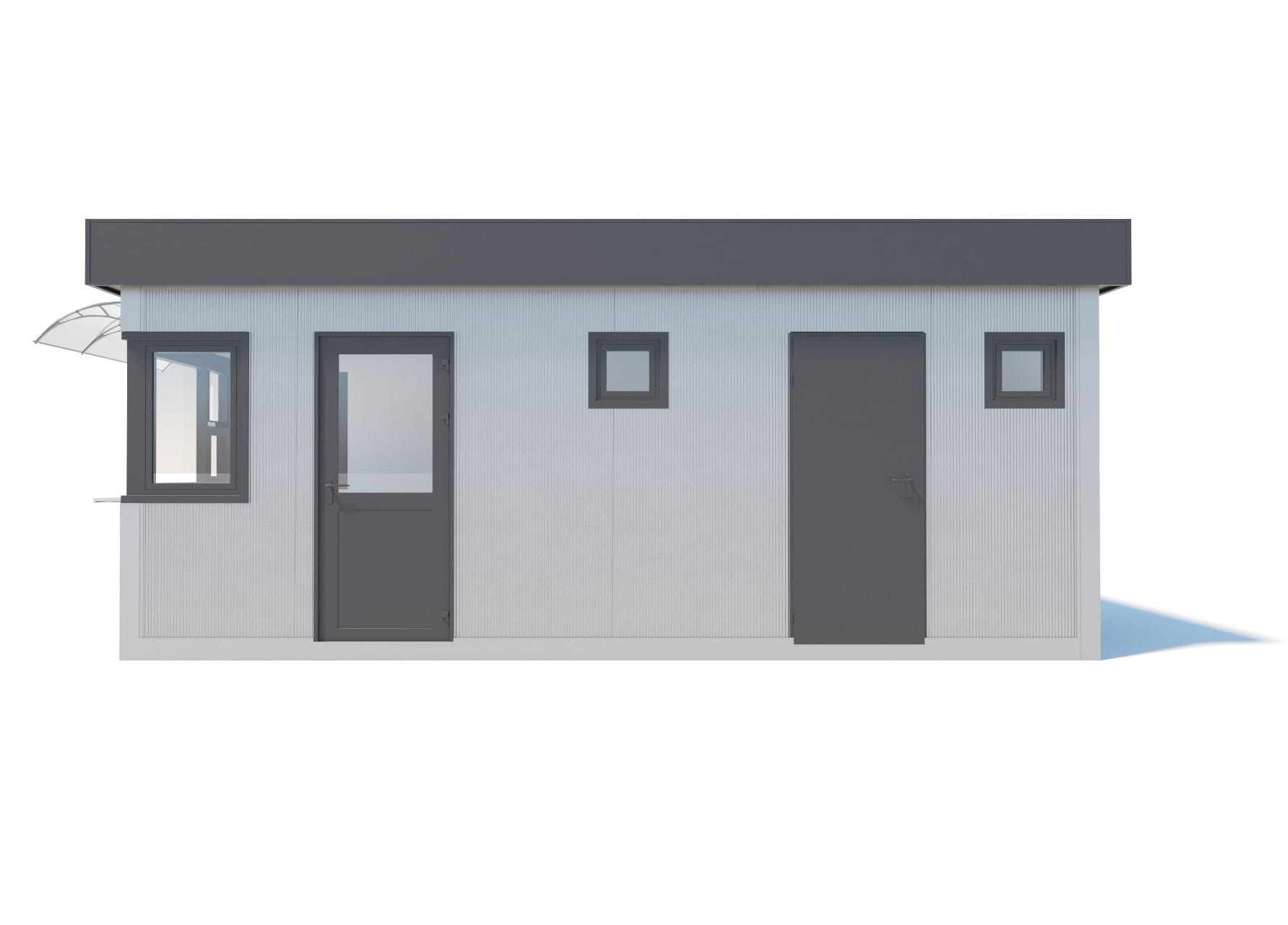 - kolor: grafit RAL 7016 (okna, drzwi, attyka), srebrny RAL 9006 (narożniki, pas dolny) - opcjonalnie dowolny kolor z palety RAL dla blach.