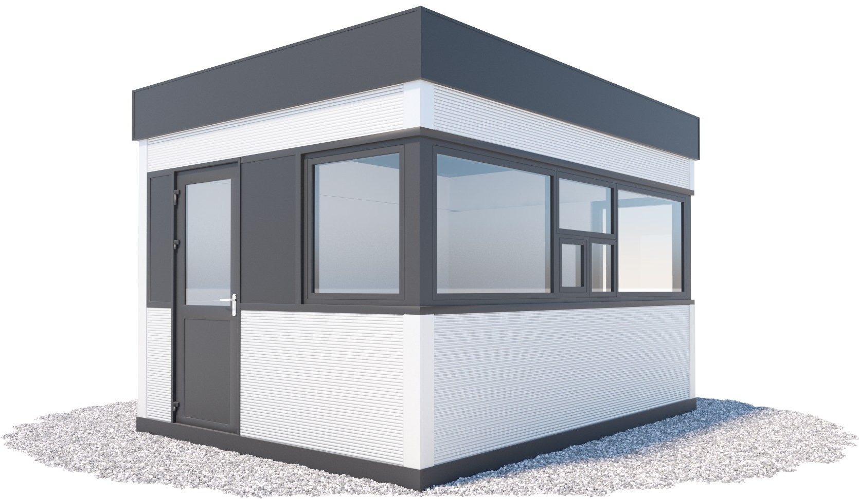 Nowoczesne stróżówki (inaczej: wartownie, portiernie kontenerowe, kontenery wartownicze) z płyty warstwowej w wariancie rozmiarowym 4 x 3 m są wykorzystywane najczęściej jako miejsce pracy pracowników ochrony odpowiedzialnych za dozór określonego terenu. Wszystkie stróżówki z oferty firmy Mobilbud to wysokiej jakości obiekty całoroczne, które charakteryzują się atrakcyjnymi warunkami termoizolacyjnymi i nowoczesną estetyką. Każda stróżówka kontenerowa o rozmiarze 4 x 3 m (przy zastosowaniu odpowiedniego układu okien i drzwi) może mieć zamontowane osobne pomieszczenie z WC i umywalką.